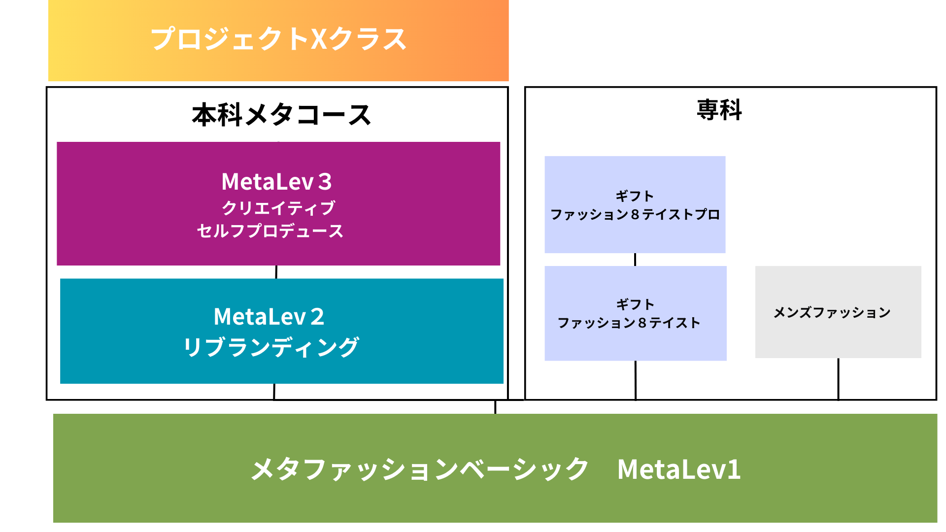 | ①メタファッション | 自分を超えるとは 超える必要があるそれぞれの課題に向き合う これからのファッション・時代性の理解・ カルチャー 世界観 自分と社会、世界観について 商標の価値理解 MFJ規定 |